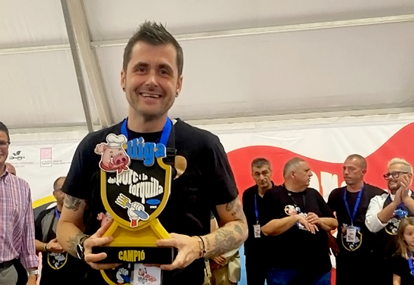 Fotografia | Juli Alcoriza, del restaurant L’Andreuenc, amb el trofeu de guanyador // Lliga del Porc i la Forquilla